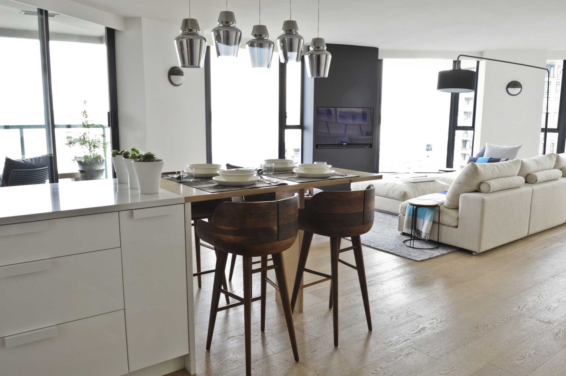 This client resided in a high-rise with breathtaking panoramic views of Vancouver and Burrard Inlet, although the interior was notably outdated. Collaborating closely with a designer, a nautical theme was envisioned and brought to life. The renovation involved nearly gutting the space to the studs, and the removal of the dividing wall between the small kitchen and dining area created an expansive open-concept space. The ensuite bathroom features a shaded glass steam shower that opens into the master bedroom.
