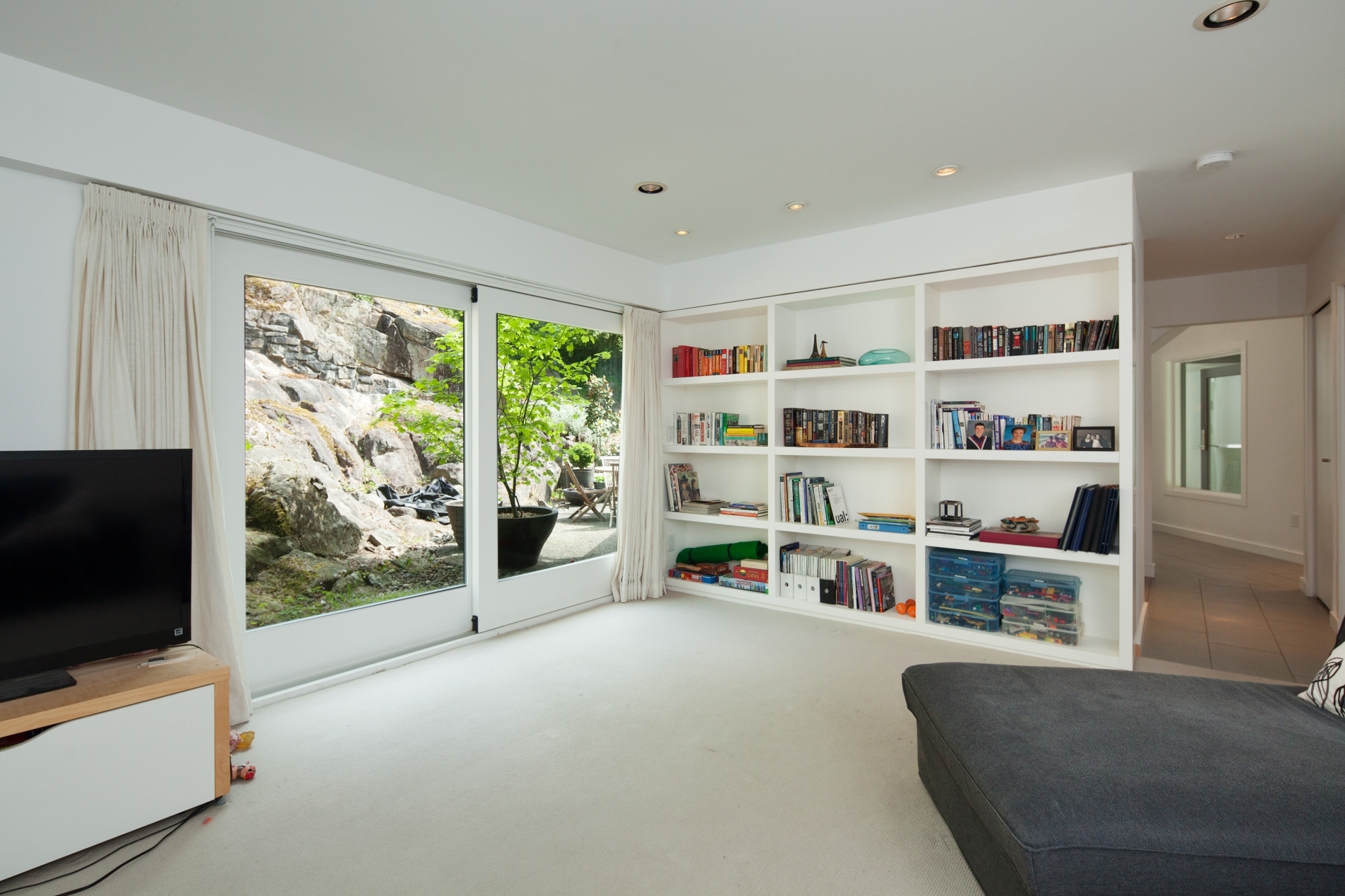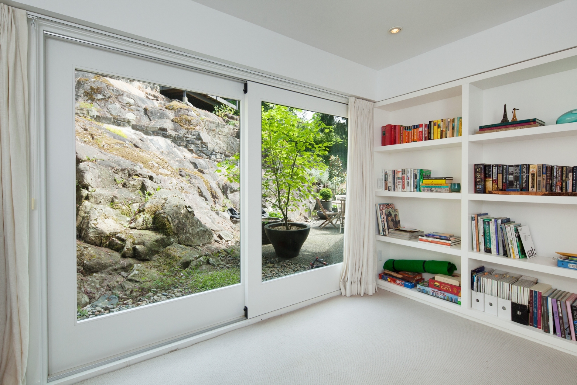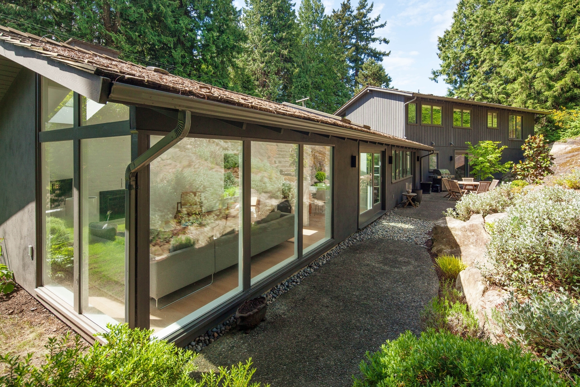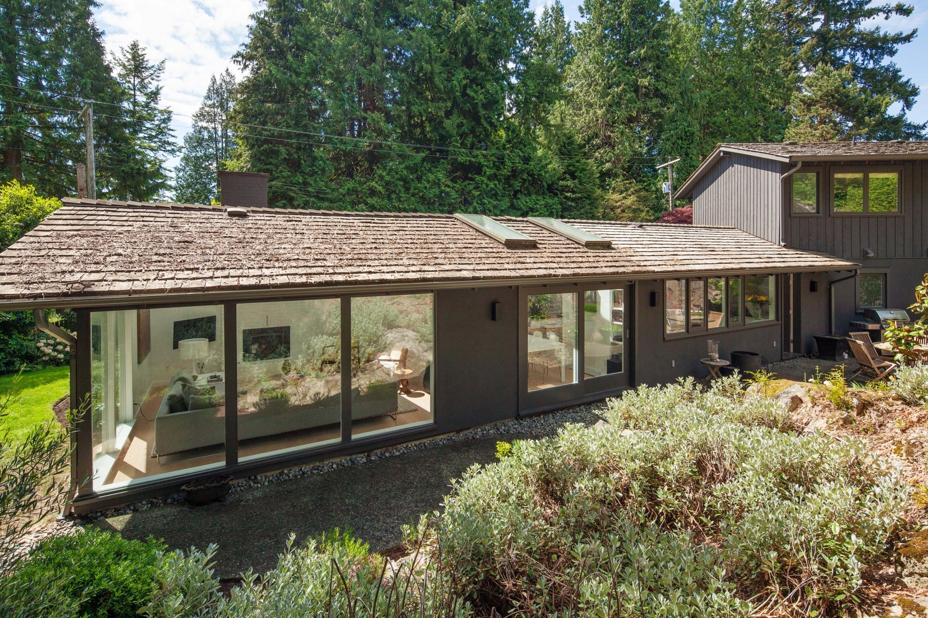 Our clients sought to transform the exterior of their home, humorously nicknamed ‘the Deathstar’. The original structure looked like two mismatched buildings fused together, complete with unappealing roof lines. The renovation involved reconstructing almost the entire roof, installing all new windows, and adding three sets of ‘lift and slide’ glass wood-framed doors to enhance natural light and airflow. In the kitchen, a modern design was chosen, predominantly featuring white. The kitchen window is seamlessly integrated with the countertop, creating a sleek and continuous look.