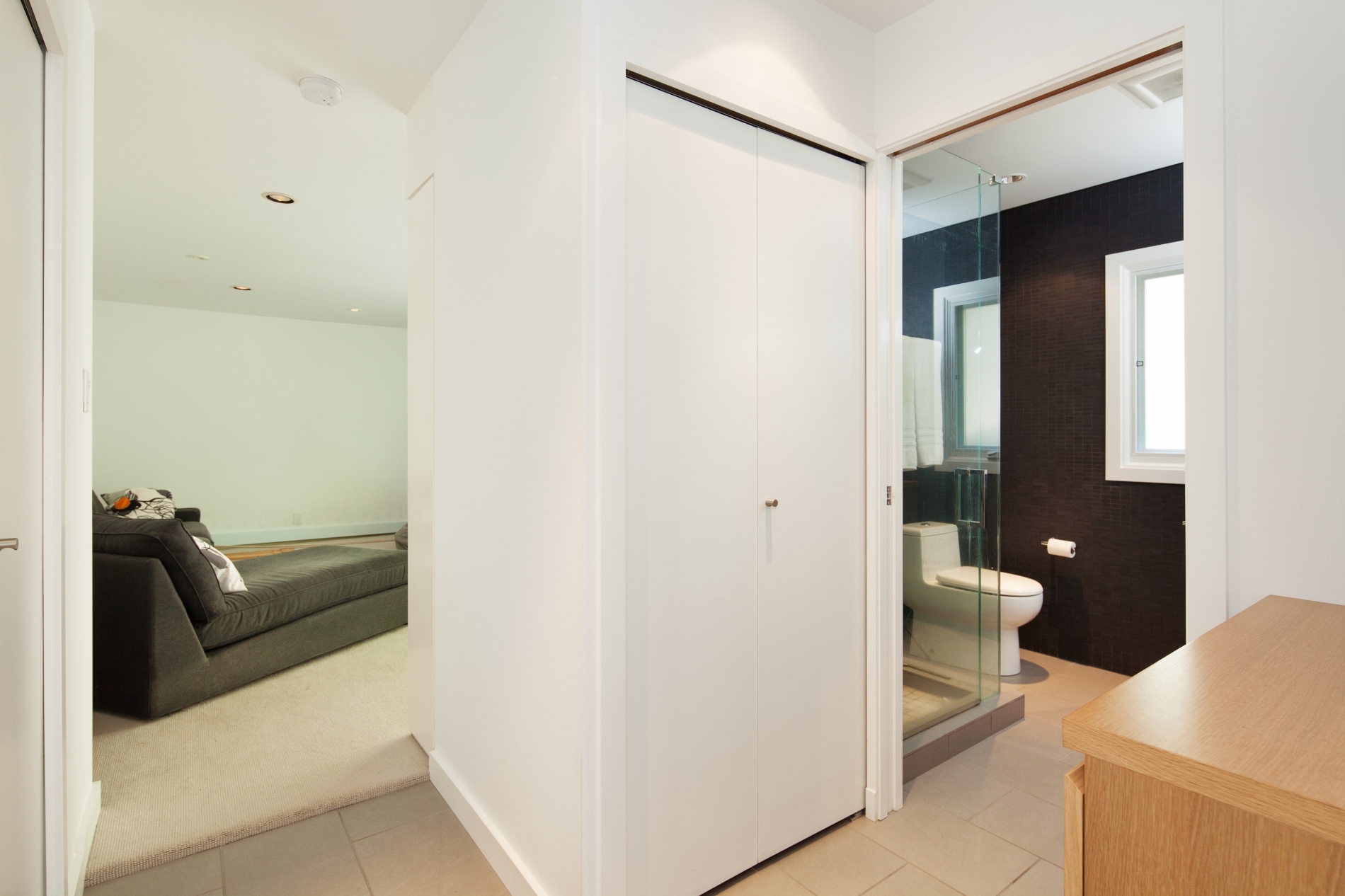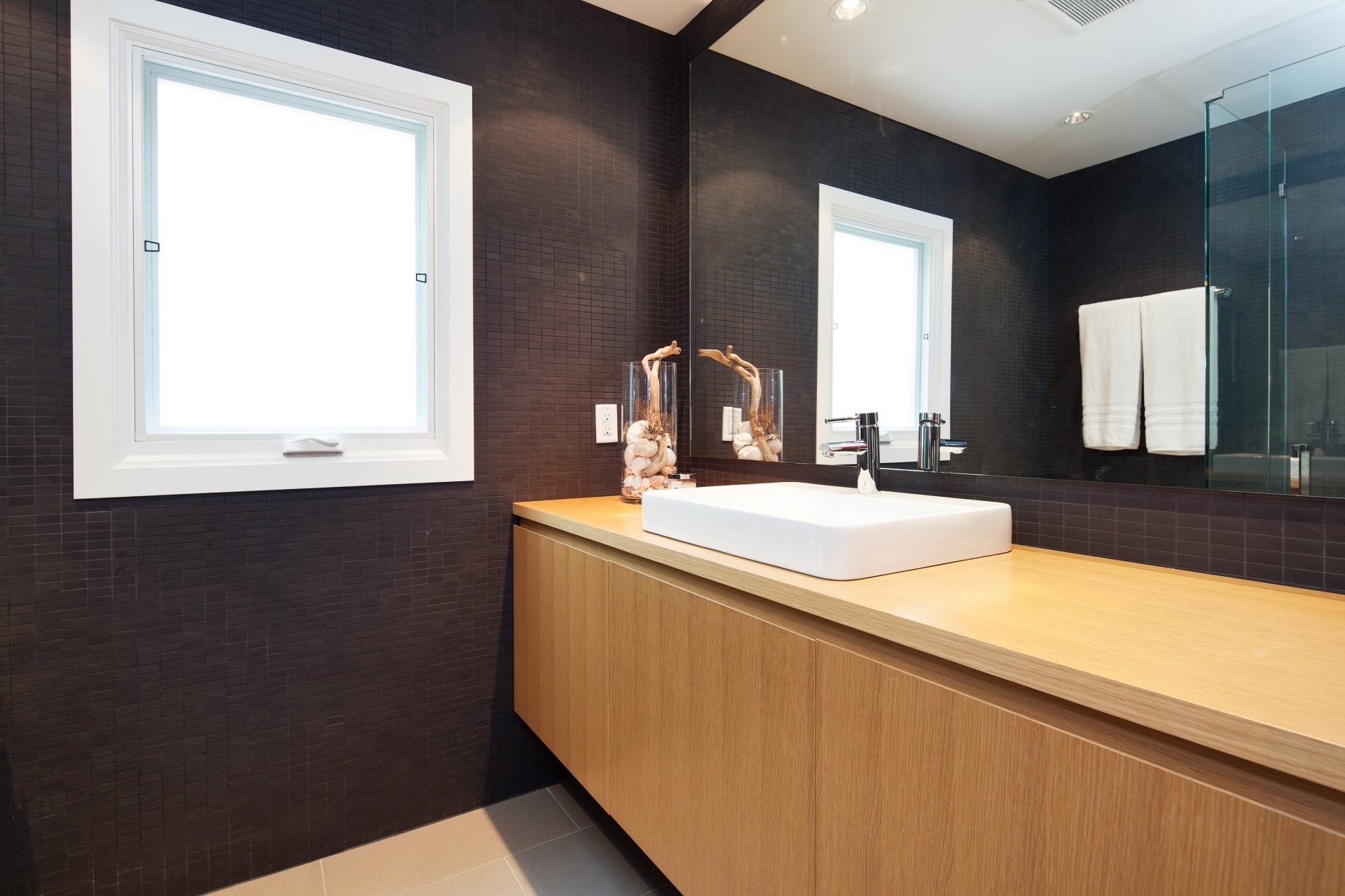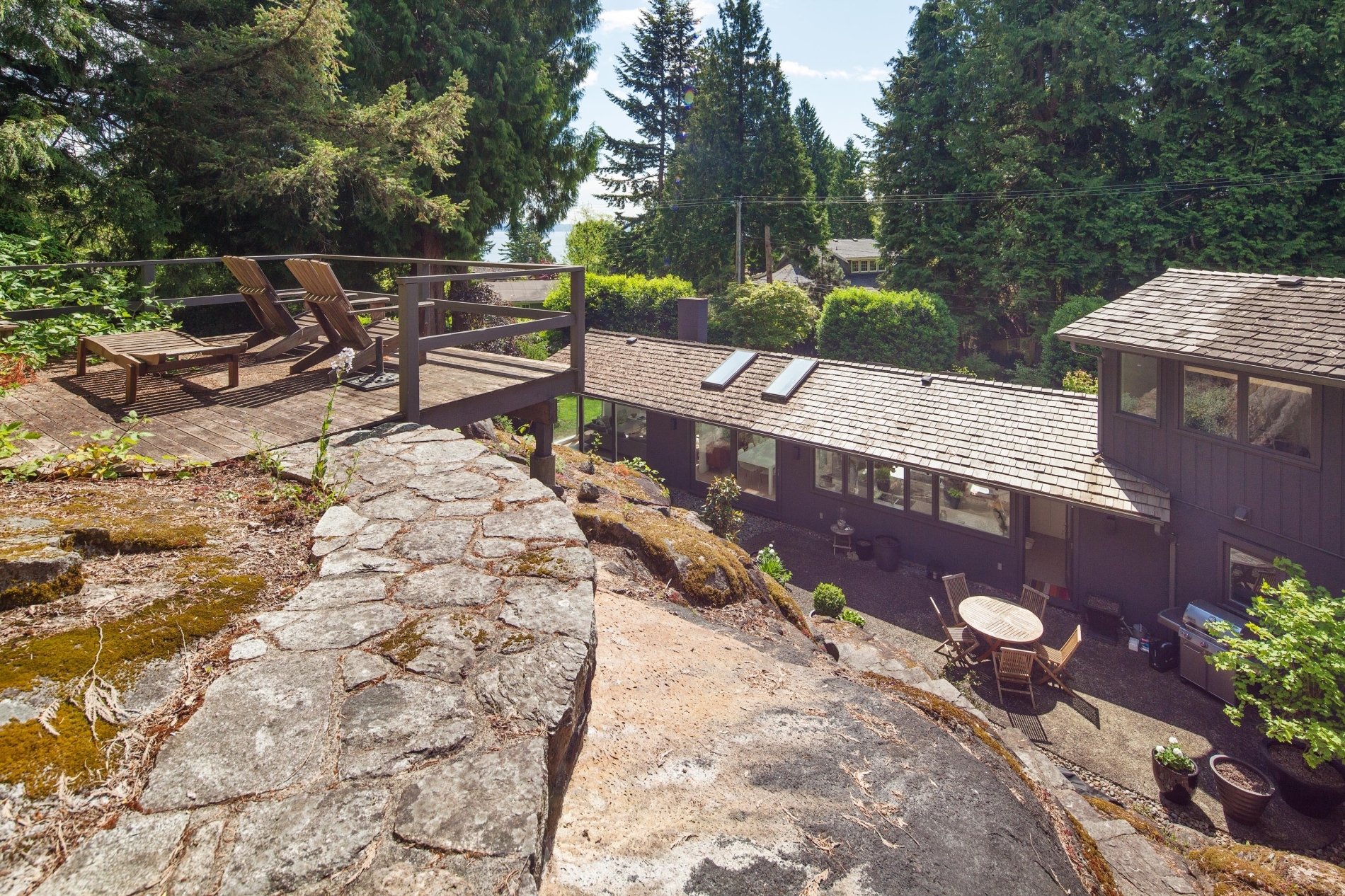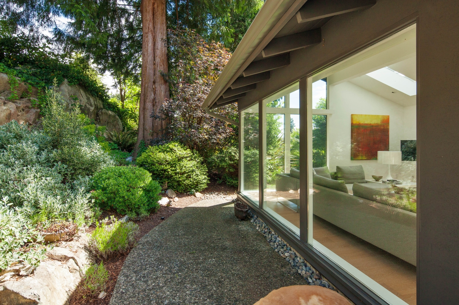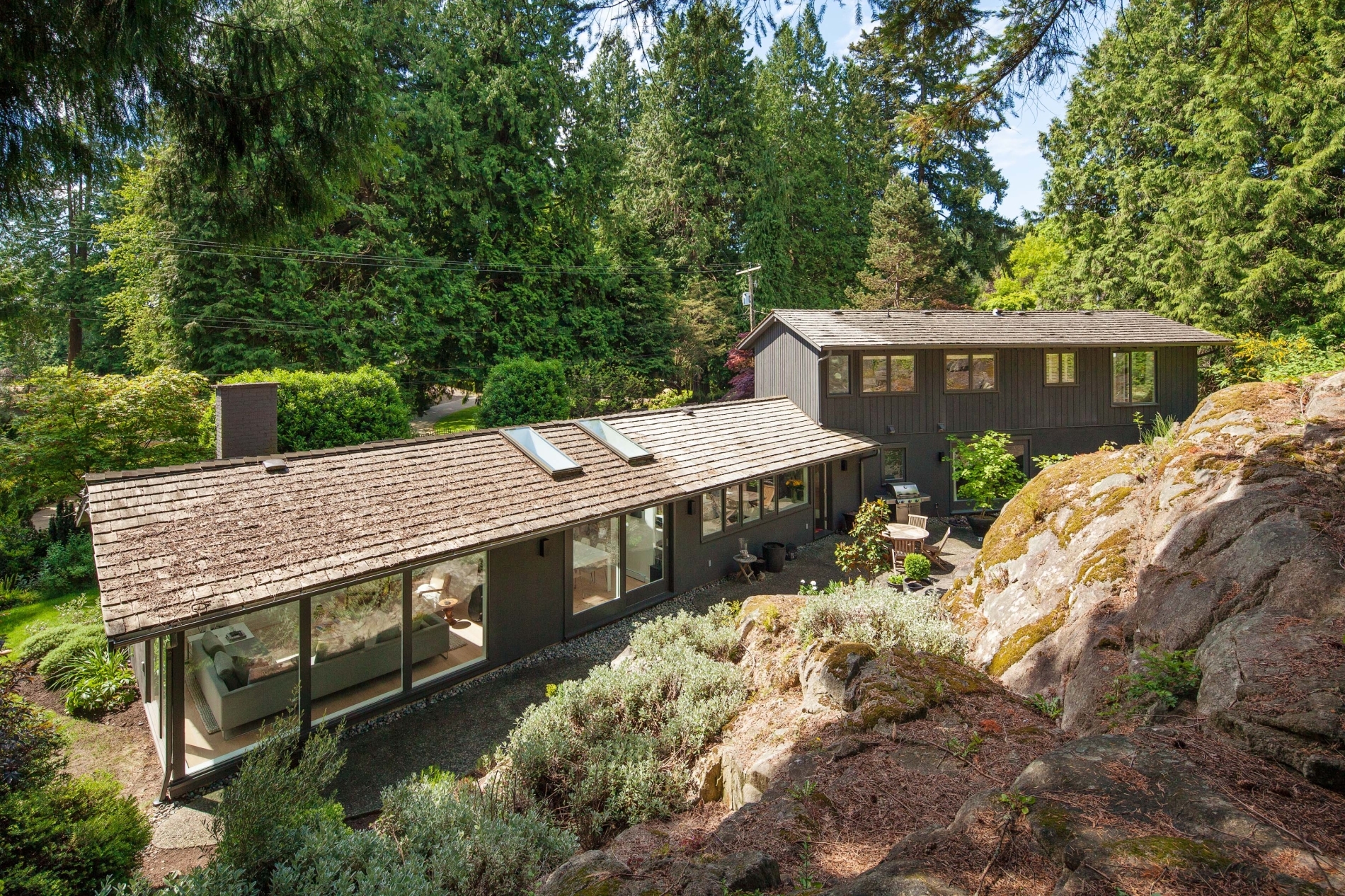 Our clients sought to transform the exterior of their home, humorously nicknamed ‘the Deathstar’. The original structure looked like two mismatched buildings fused together, complete with unappealing roof lines. The renovation involved reconstructing almost the entire roof, installing all new windows, and adding three sets of ‘lift and slide’ glass wood-framed doors to enhance natural light and airflow. In the kitchen, a modern design was chosen, predominantly featuring white. The kitchen window is seamlessly integrated with the countertop, creating a sleek and continuous look.